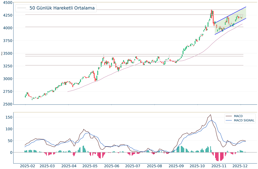 Ons Altın geçtiğimiz gün %0.52 artarak 4.209 seviyelerinden işlem görüyorken 50 günlük hareketli ortalaması olan 4.077 seviyesinin de %3 üzerinde seyrediyor. Bu seviyeye göre Ons Altın için orta vadeli negatif görünüm hakimdir. Destek ve direnç seviyeleri; Yükseliş halinde ilk direnç olarak 4.315 seviyesi takip edilirken bu direncin de geçilmesi halinde 4.327 takip edilebilir. Negatif hareketlerde ise destekler 4.196 ve 4.128 olarak izlenebilir.