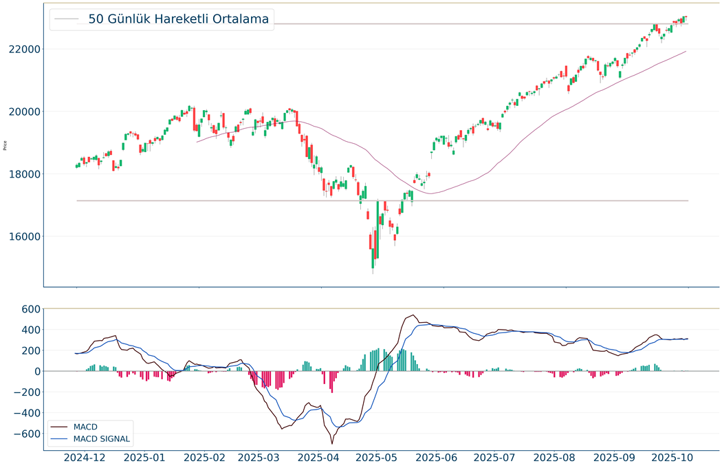 Nasdaq Endeksi, günlük periyotta %0.08 düştü. Haftalık bakıldığında %0.79 yukarıda ve aylık bakıldığında ise %4.45 yukarıda seyrederken güncel olarak 23.024 seviyesinden işlem görmekte. Teknik göstergelere bakıldığında MACD çizgisi sinyal çizgisinin üzerinde, pozitif bölgede yer alıyor. Ayrıca RSI değerine göre aşırı alım veya satım bölgesinde olmadığı gözleniyor. İşlem yaparken 23.497 ve 23.643 dirençleri ve 22.820 ve 22.468 destekleri izlenebilir.