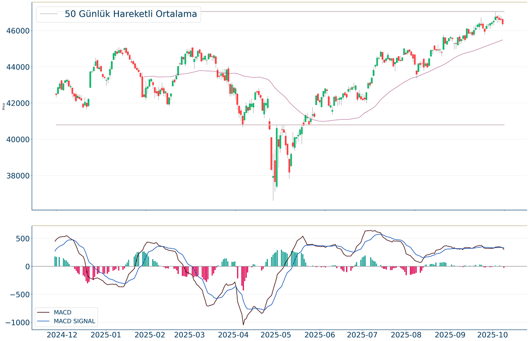 Dow Jones Endeksi dün gerçekleşen işlemlerde en yüksek 46.684, en düşük ise 46.271 seviyesinde işlem gördükten sonra %0.52 azalarak azalarak 46.358 seviyesinde günü tamamladı. 20 günlük hareketli ortalamanın altında hareket etmesi ise Dow Jones Endeksi adına olumsuz olarak nitelendirilebilir. Gün içi işlemlerde 46.048 ve 45.262 desteklerini ve 47.442 ve 47.719 dirençlerini takip edeceğiz.