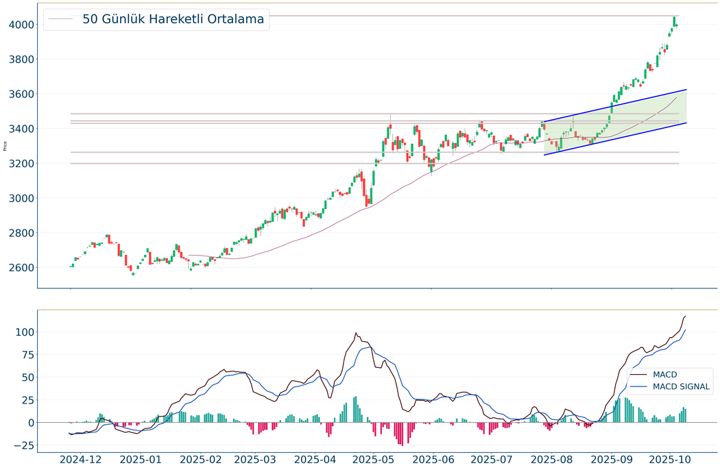 Ons Altın, günlük periyotta %1.08 düştü. Haftalık bakıldığında %4.16 yukarıda ve aylık bakıldığında ise %9.97 yukarıda seyrederken güncel olarak 3.999 seviyesinden işlem görmekte. Teknik göstergelere bakıldığında MACD çizgisi sinyal çizgisinin üzerinde, pozitif bölgede yer alıyor. Ayrıca RSI değerine göre aşırı alım bölgesinde olduğu gözleniyor. İşlem yaparken 4.082 ve 4.110 dirençleri ve 3.962 ve 3.898 destekleri izlenebilir.