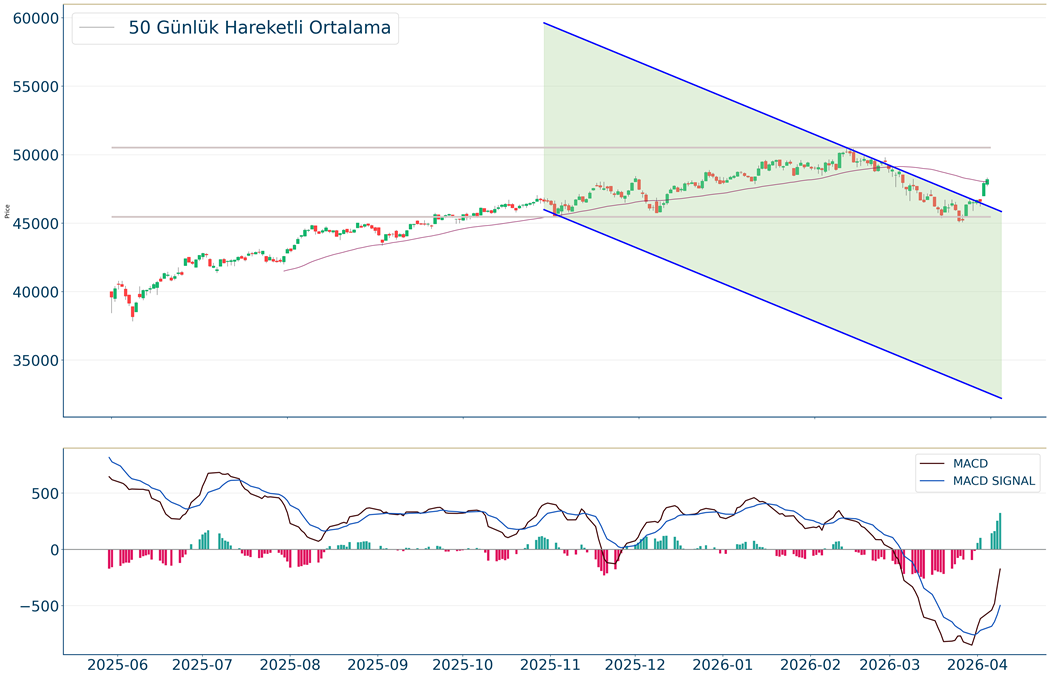 Dow Jones Endeksi geçtiğimiz gün %0.58 artarak 48.185 seviyelerinden işlem görüyorken 50 günlük hareketli ortalaması olan 48.020 seviyesinin de %0 üzerinde seyrediyor. Bu seviyeye göre Dow Jones Endeksi için orta vadeli negatif görünüm hakimdir. Destek ve direnç seviyeleri; Yukarı yönlü hareketlerde izlenebilecek birinci direnç 49.175 olurken destek olarak 47.663 izlenebilir.