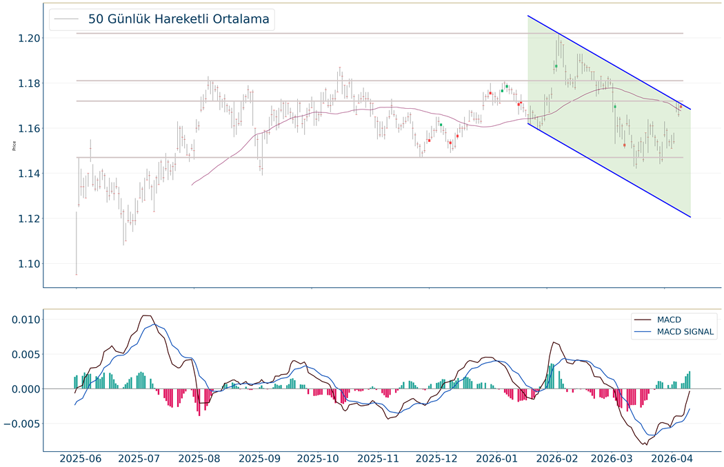 EUR/USD geçtiğimiz gün %0.3 artarak 1,169 seviyelerinden işlem görüyorken 50 günlük hareketli ortalaması olan 1,168 seviyesinin de %0 üzerinde seyrediyor. Bu seviyeye göre EUR/USD için orta vadeli negatif görünüm hakimdir. Destek ve direnç seviyeleri; Yukarı yönlü hareketlerde izlenebilecek birinci direnç 1,194 olurken destek olarak 1,162 izlenebilir.