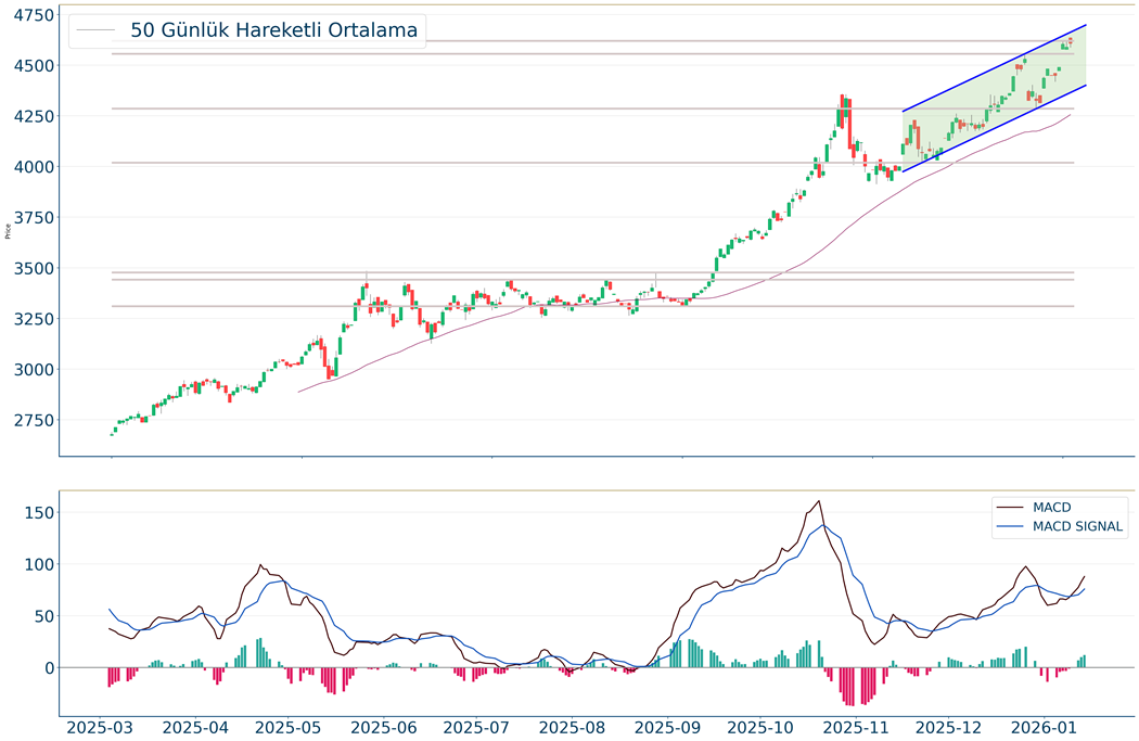 Gün içi görülen en yüksek seviye 4.637 iken kapanış 4.607 seviyesinde %0.4 yükseliş ile gerçekleşti. Ortalama işlem hacimlerine bakıldığında ise 5 iş günü için gözlenirken 5 günlük hareketli ortalamanın üzerinde hareket etmesi kısa vadedeki olumlu görünüme işaret ediyor. Ayrıca, gün itibarıyla 4.571 seviyesi yeni destek görevi görürken kısa vadeli direnç 4.712 seviyesi oldu. Endeksin aşağı yönlü hareketini devam ettirmesi halinde 4.492 seviyesi ikinci destek görevi görürken yukarı yönlü hareketlerde ise 4.744 seviyesini ikinci direnç olarak izleyeceğiz.