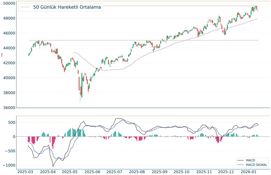 Geçtiğimiz günü %0.09 düşüşle tamamladı. Dow Jones Endeksi 20 günlük hareketli ortalamasının üzerinde kapanış gerçekleştirerek aylık görünümünü güçlendirdi. Yukarı yönlü hareketlerde izlenebilecek birinci direnç 50.139 olurken destek olarak 48.697 izlenebilir.