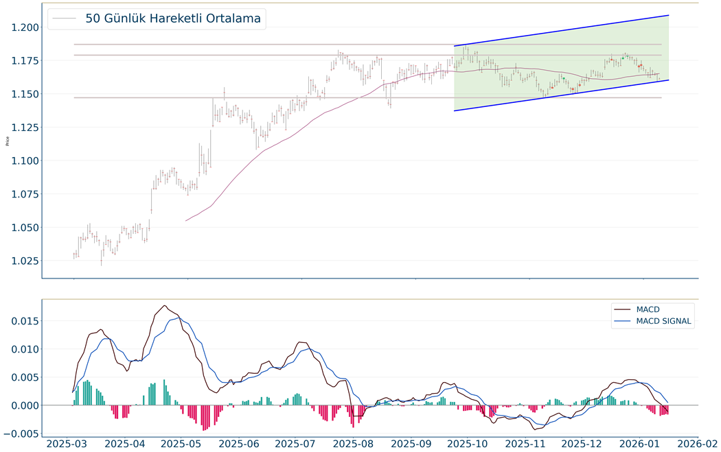 EUR/USD kapanışla birlikte %0.29 düşüş gerçekleştirdi. Güne 1,161 seviyesinde başladı ve gün içinde en yüksek 1,162, en düşük 1,161 seviyesinden işlem gördü. Kapanışı ise 1,161 seviyesinde tamamladı. Son kapanış 5 günlük hareketli ortalamanın altında gerçekleşti. MACD sat pozisyonunda, negatif bölgede hareket ediyor. Yükseliş halinde ilk direnç olarak 1,185 seviyesi takip edilirken bu direncin de geçilmesi halinde 1,19 takip edilebilir. Negatif hareketlerde ise destekler 1,153 ve 1,137 olarak izlenebilir.