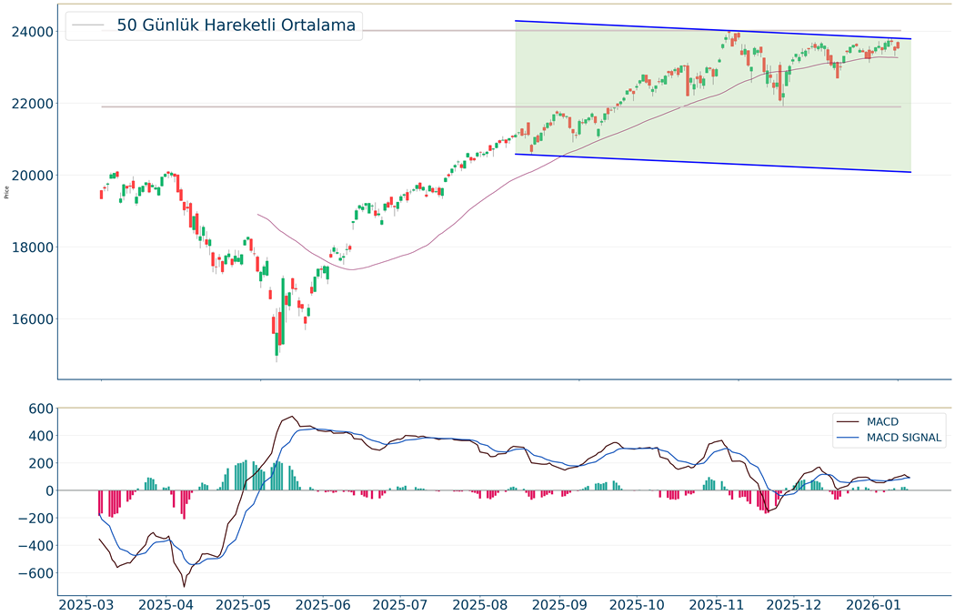 Nasdaq Endeksi dün gerçekleşen işlemlerde en yüksek 23.721, en düşük ise 23.502 seviyesinde işlem gördükten sonra %0.25 artarak artarak 23.530 seviyesinde günü tamamladı. 20 günlük hareketli ortalamanın altında hareket etmesi ise Nasdaq Endeksi adına olumsuz olarak nitelendirilebilir. Gün içi işlemlerde 23.382 ve 22.976 desteklerini ve 24.093 ve 24.232 dirençlerini takip edeceğiz.