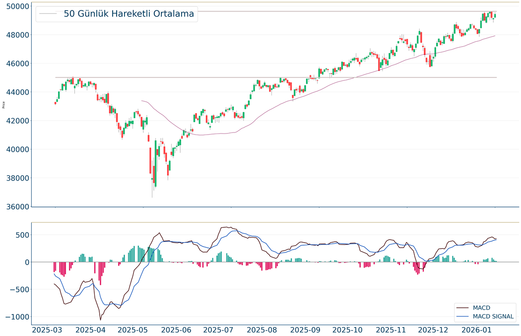 Dow Jones Endeksi geçtiğimiz günü 49.442 seviyesinde %0.6 yükselişle tamamladı. Önemli momentum indikatörlerinden biri olan RSI değerine bakıldığında ise aşırı alım veya satım bölgesinde olmadığı görülebilir. Öte yandan, ilk direnç olarak 50.487 seviyesi karşımıza çıkarken bu seviyenin üzerinde 50.801 direncine yönelim gerçekleşebilir. Aşağı yönlü işlemlerde ise 49.023 ve 48.247 destekleri takip edilmelidir.