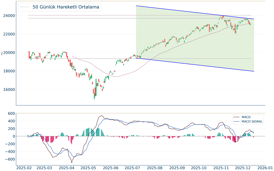 Gün içi görülen en yüksek seviye 23.162 iken kapanış 23.111 seviyesinde %0.23 yükseliş ile gerçekleşti. Ortalama işlem hacimlerine bakıldığında ise 5 iş günü için gözlenirken 5 günlük hareketli ortalamanın altında hareket etmesi kısa vadedeki olumsuz görünüme işaret ediyor. Ayrıca, gün itibarıyla 22.879 seviyesi yeni destek görevi görürken kısa vadeli direnç 23.584 seviyesi oldu. Endeksin aşağı yönlü hareketini devam ettirmesi halinde 22.505 seviyesi ikinci destek görevi görürken yukarı yönlü hareketlerde ise 23.762 seviyesini ikinci direnç olarak izleyeceğiz.