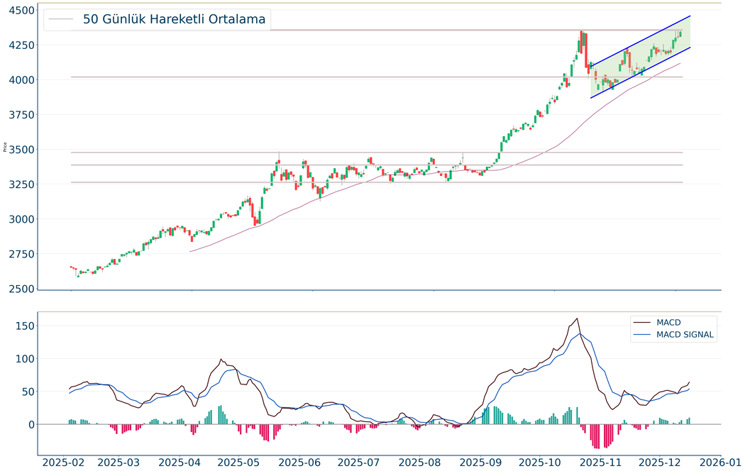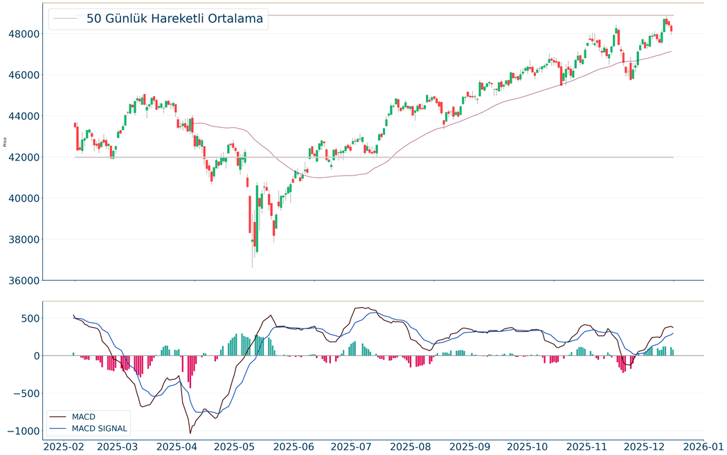 Dow Jones Endeksi, geçtiğimiz günü %0.62 düşüş ile kapattıktan sonra, 20 günlük hareketli ortalaması olan 47.421 seviyesinin üzerinde fiyatlanıyor. Bu durum Dow Jones Endeksi için aylık periyotta pozitif bir görüntü çiziyor. Son günde yapılan işlemlerde ise en yüksek 48.452 seviyesinde işlem gördükten sonra günü 48.114 seviyesinde tamamladı. Öte yandan, trend göstergelerinden biri olan MACD al pozisyonunda, pozitif bölgede hareket ediyor. 49.230-49.551 dirençler, 47.758-46.926 destekler olarak değerlendirilebilir.