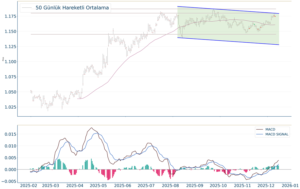 EUR/USD, geçtiğimiz günü %0.09 düşüş ile kapattıktan sonra, 20 günlük hareketli ortalaması olan 1,163 seviyesinin üzerinde fiyatlanıyor. Bu durum EUR/USD için aylık periyotta pozitif bir görüntü çiziyor. Son günde yapılan işlemlerde ise en yüksek 1,176 seviyesinde işlem gördükten sonra günü 1,174 seviyesinde tamamladı. Öte yandan, trend göstergelerinden biri olan MACD al pozisyonunda, pozitif bölgede hareket ediyor. 1,199-1,204 dirençler, 1,167-1,15 destekler olarak değerlendirilebilir.