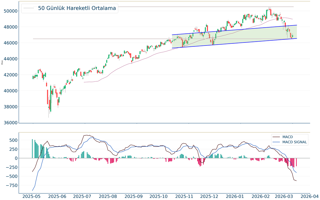 Gün içi görülen en yüksek seviye 47.176 iken kapanış 46.946 seviyesinde %0.83 yükseliş ile gerçekleşti. Ortalama işlem hacimlerine bakıldığında ise 5 iş günü için gözlenirken 5 günlük hareketli ortalamanın altında hareket etmesi kısa vadedeki olumsuz görünüme işaret ediyor. Ayrıca, gün itibarıyla 46.555 seviyesi yeni destek görevi görürken kısa vadeli direnç 47.981 seviyesi oldu. Endeksin aşağı yönlü hareketini devam ettirmesi halinde 45.771 seviyesi ikinci destek görevi görürken yukarı yönlü hareketlerde ise 48.305 seviyesini ikinci direnç olarak izleyeceğiz.
