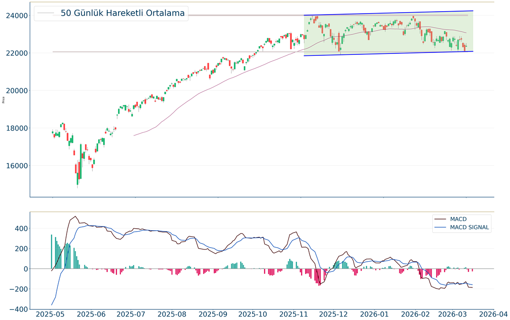 Nasdaq Endeksi, günlük periyotta %1.22 arttı. Haftalık bakıldığında %1.42 aşağıda ve aylık bakıldığında ise %0.77 aşağıda seyrederken güncel olarak 22.374 seviyesinden işlem görmekte. Teknik göstergelere bakıldığında MACD sat pozisyonunda, negatif bölgede hareket ediyor. Ayrıca RSI değerine göre aşırı alım veya satım bölgesinde olmadığı gözleniyor. İşlem yaparken 22.891 ve 23.029 dirençleri ve 22.216 ve 21.838 destekleri izlenebilir.