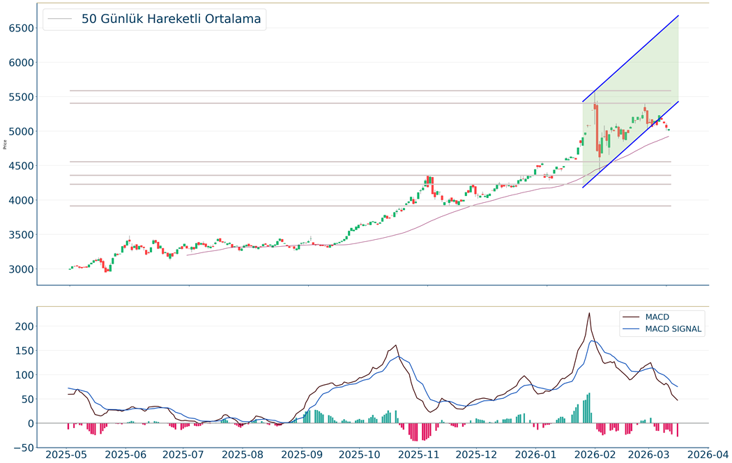 Ons Altın kapanışla birlikte %0.48 düşüş gerçekleştirdi. Güne 5.012 seviyesinde başladı ve gün içinde en yüksek 5.034, en düşük 4.998 seviyesinden işlem gördü. Kapanışı ise 5.028 seviyesinde tamamladı. Kısa vadede negatif görünüm mevcuttur. MACD sat pozisyonunda, pozitif bölgede hareket ediyor. Yükseliş halinde ilk direnç olarak 5.130 seviyesi takip edilirken bu direncin de geçilmesi halinde 5.162 takip edilebilir. Negatif hareketlerde ise destekler 4.982 ve 4.906 olarak izlenebilir.