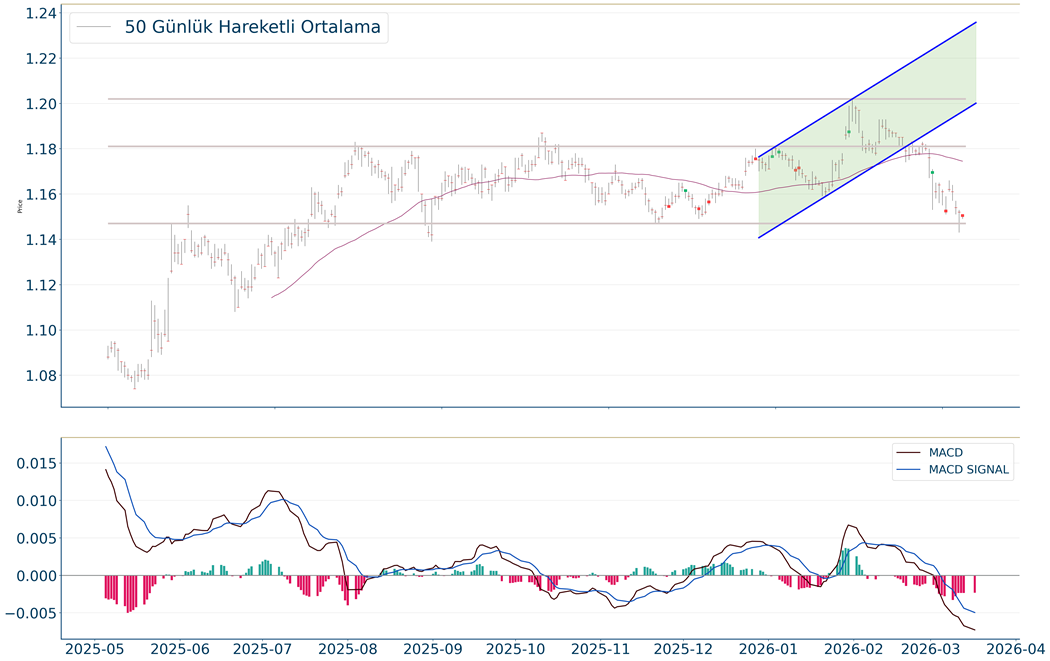 EUR/USD, geçtiğimiz günü %0.2 düşüş ile kapattıktan sonra, 20 günlük hareketli ortalaması olan 1,17 seviyesinin altında fiyatlanıyor. Bu durum EUR/USD için aylık periyotta negatif bir görüntü çiziyor. Son günde yapılan işlemlerde ise en yüksek 1,151 seviyesinde işlem gördükten sonra günü 1,15 seviyesinde tamamladı. Öte yandan, trend göstergelerinden biri olan MACD çizgisi sinyal çizgisinin altında, negatif bölgede yer alıyor. 1,174-1,178 dirençler, 1,142-1,126 destekler olarak değerlendirilebilir.