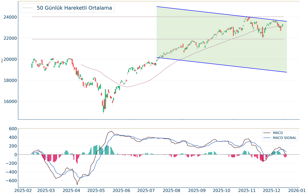 Geçtiğimiz günü %1.31 yükselişle tamamladı. Nasdaq Endeksi 20 günlük hareketli ortalamasının üzerinde kapanış gerçekleştirerek aylık görünümünü güçlendirdi. 23.529 seviyesinin geçilmesi halinde yükseliş eğilimli hareketler izlenebilirken yeni direnç olarak 23.760 karşımıza çıkacaktır. 22.825 ise önemli destek konumundadır. Bu desteğin altına gelinmesi halinde 23.064 yeni destek olarak takip edilebilir.