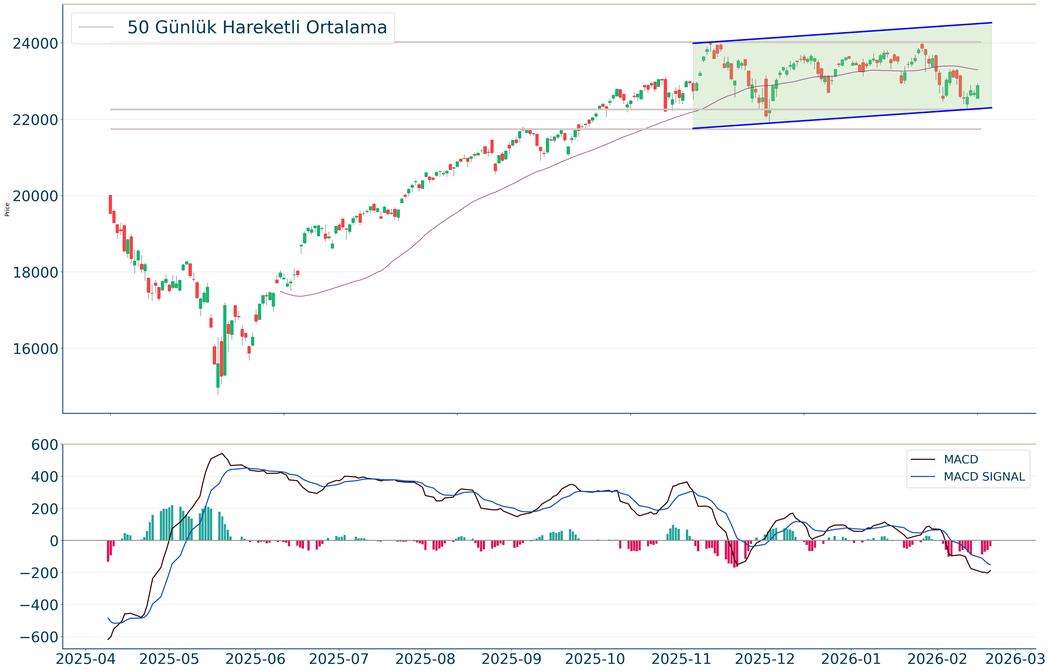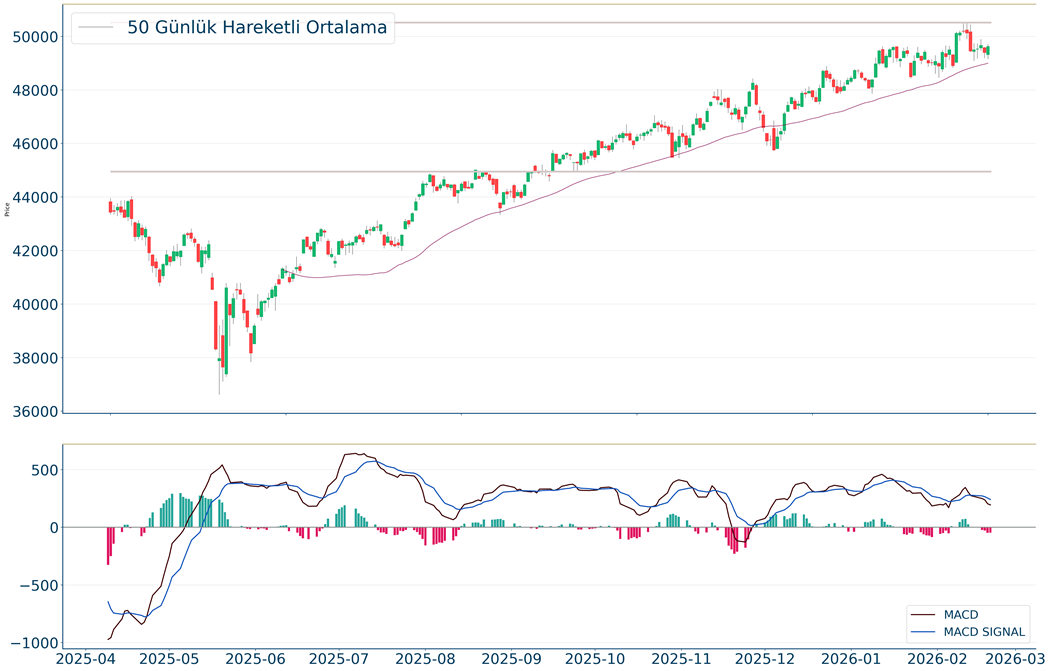 Dow Jones Endeksi için günlük değişim %0.47 yükselişle gerçekleşmiş oldu.Son kapanış 5 günlük hareketli ortalamanın üzerinde gerçekleşti. 50.476 seviyesinin geçilmesi halinde yükseliş eğilimli hareketler izlenebilirken yeni direnç olarak 50.624 karşımıza çıkacaktır. 49.004 ise önemli destek konumundadır. Bu desteğin altına gelinmesi halinde 49.100 yeni destek olarak takip edilebilir.