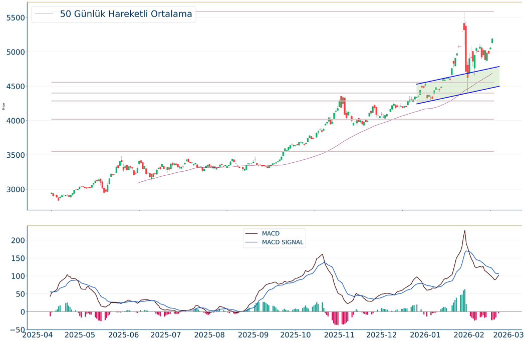 Gün içi görülen en yüksek seviye 5.198 iken kapanış 5.192 seviyesinde %2.63 yükseliş ile gerçekleşti. Ortalama işlem hacimlerine bakıldığında ise 5 iş günü için gözlenirken 5 günlük hareketli ortalamanın üzerinde hareket etmesi kısa vadedeki olumlu görünüme işaret ediyor. Ayrıca, gün itibarıyla 5.126 seviyesi yeni destek görevi görürken kısa vadeli direnç 5.293 seviyesi oldu. Endeksin aşağı yönlü hareketini devam ettirmesi halinde 5.038 seviyesi ikinci destek görevi görürken yukarı yönlü hareketlerde ise 5.344 seviyesini ikinci direnç olarak izleyeceğiz.