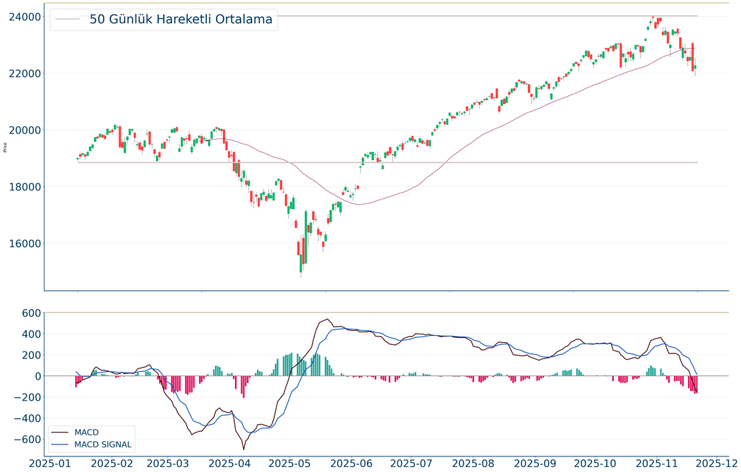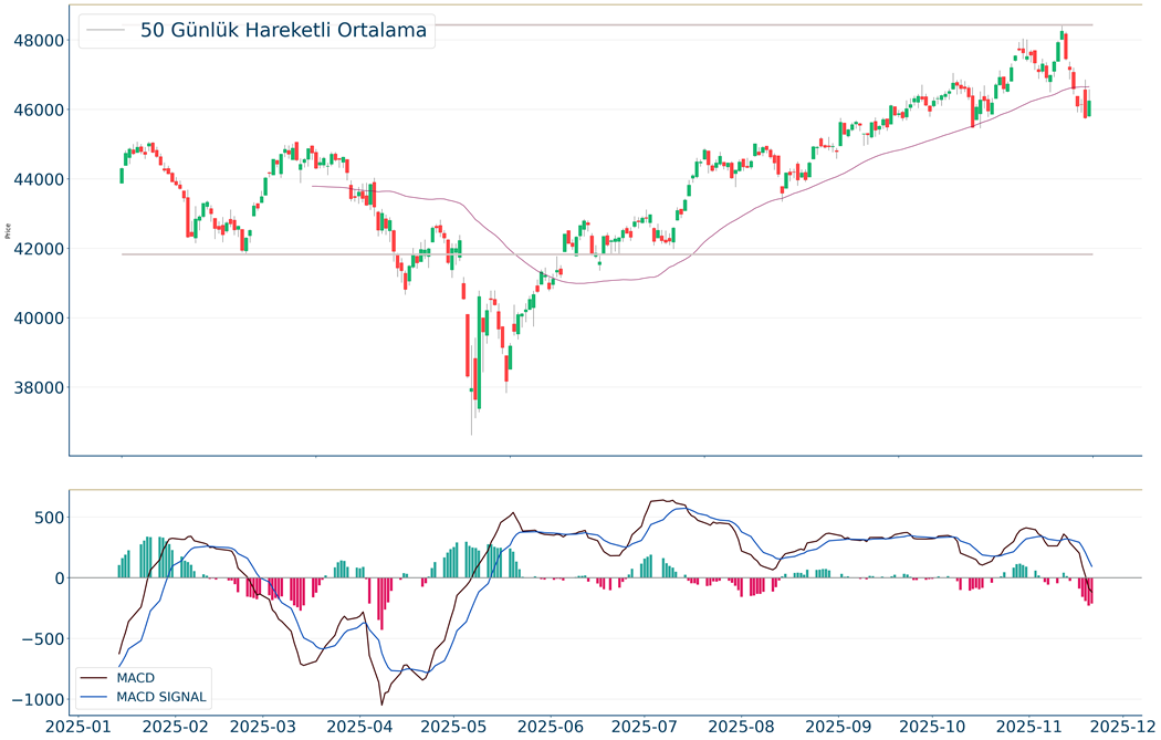 Dow Jones Endeksi, geçtiğimiz günü %1.08 yükseliş ile kapattıktan sonra, 20 günlük hareketli ortalaması olan 47.128 seviyesinin altında fiyatlanıyor. Bu durum Dow Jones Endeksi için aylık periyotta negatif bir görüntü çiziyor. Son günde yapılan işlemlerde ise en yüksek 46.577 seviyesinde işlem gördükten sonra günü 46.245 seviyesinde tamamladı. Öte yandan, trend göstergelerinden biri olan MACD çizgileri sat konumunda, sıfır çizgisinin altında hareket ediyor. 47.287-47.730 dirençler, 45.771-44.901 destekler olarak değerlendirilebilir.