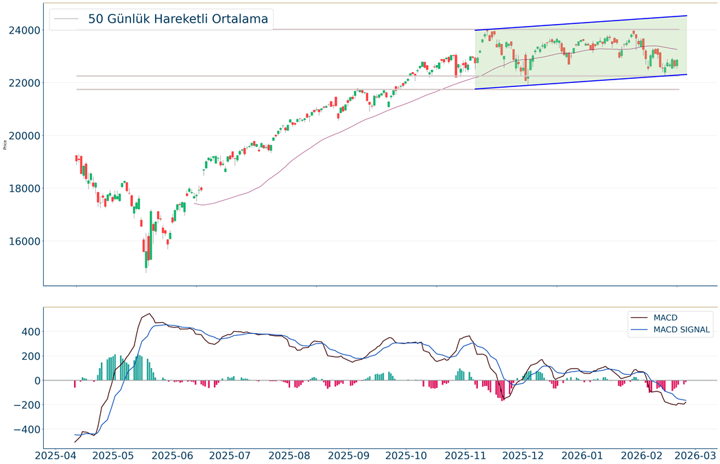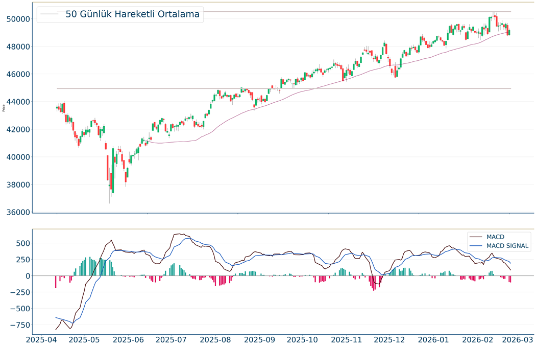 Dow Jones Endeksi, günlük periyotta %0.76 arttı. Haftalık bakıldığında %0.72 aşağıda ve aylık bakıldığında ise %0.48 aşağıda seyrederken güncel olarak 49.174 seviyesinden işlem görmekte. Teknik göstergelere bakıldığında MACD çizgileri sat konumunda, sıfır çizgisinin üzerinde hareket ediyor. Ayrıca RSI değerine göre aşırı alım veya satım bölgesinde olmadığı gözleniyor. İşlem yaparken 50.184 ve 50.573 dirençleri ve 48.675 ve 47.871 destekleri izlenebilir.