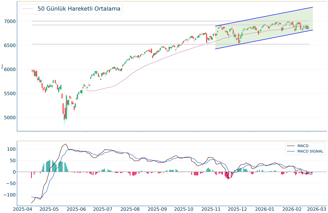 S&P 500 Endeksi, günlük periyotta %0.77 arttı. Haftalık bakıldığında %0.68 yukarıda ve aylık bakıldığında ise %0.87 aşağıda seyrederken güncel olarak 6.890 seviyesinden işlem görmekte. Teknik göstergelere bakıldığında MACD çizgileri sat konumunda, sıfır çizgisinin altında hareket ediyor. Ayrıca RSI değerine göre aşırı alım veya satım bölgesinde olmadığı gözleniyor. İşlem yaparken 7.026 ve 7.085 dirençleri ve 6.812 ve 6.699 destekleri izlenebilir.