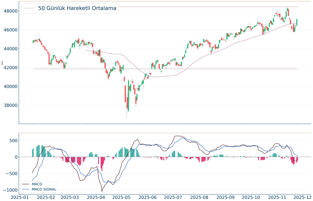 Dow Jones Endeksi için günlük değişim %1.43 yükselişle gerçekleşmiş oldu.Son kapanış 5 günlük hareketli ortalamanın üzerinde gerçekleşti. Yükseliş halinde ilk direnç olarak 48.018 seviyesi takip edilirken bu direncin de geçilmesi halinde 48.541 takip edilebilir. Negatif hareketlerde ise destekler 46.467 ve 45.637 olarak izlenebilir.