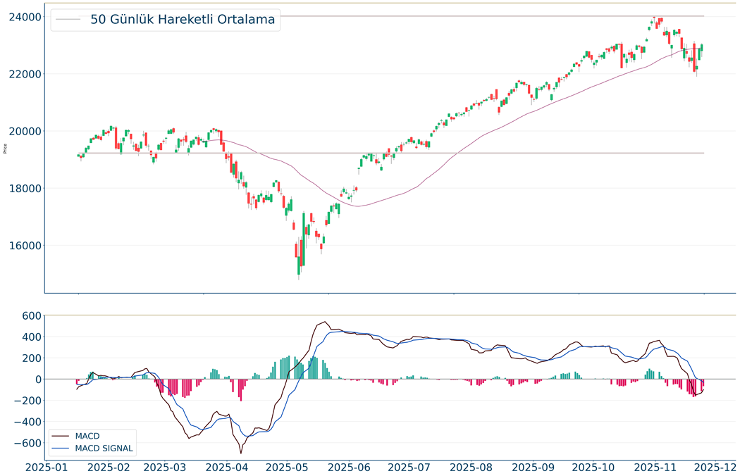 Nasdaq Endeksi, günlük periyotta %0.67 arttı. Haftalık bakıldığında %2.64 yukarıda ve aylık bakıldığında ise %3.37 aşağıda seyrederken güncel olarak 23.025 seviyesinden işlem görmekte. Teknik göstergelere bakıldığında MACD çizgileri sat konumunda, sıfır çizgisinin altında hareket ediyor. Ayrıca RSI değerine göre aşırı alım veya satım bölgesinde olmadığı gözleniyor. İşlem yaparken 23.465 ve 23.750 dirençleri ve 22.684 ve 22.260 destekleri izlenebilir.