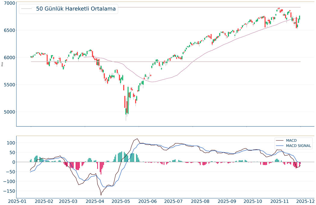 S&P 500 Endeksi, günlük periyotta %0.91 arttı. Haftalık bakıldığında %2.25 yukarıda ve aylık bakıldığında ise %1.81 aşağıda seyrederken güncel olarak 6.765 seviyesinden işlem görmekte. Teknik göstergelere bakıldığında MACD çizgileri sat konumunda, sıfır çizgisinin altında hareket ediyor. Ayrıca RSI değerine göre aşırı alım veya satım bölgesinde olmadığı gözleniyor. İşlem yaparken 6.896 ve 6.969 dirençleri ve 6.675 ve 6.557 destekleri izlenebilir.