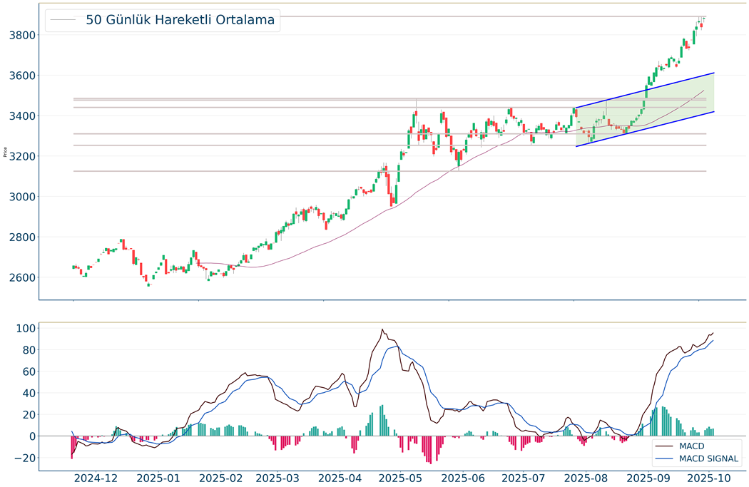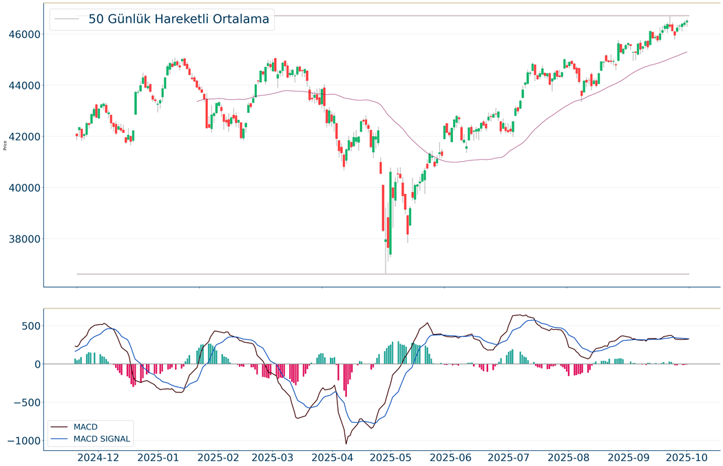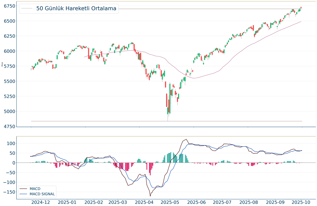 S&P 500 Endeksi, geçtiğimiz günü %0.06 yükseliş ile kapattıktan sonra, 20 günlük hareketli ortalaması olan 6.616 seviyesinin üzerinde fiyatlanıyor. Bu durum S&P 500 Endeksi için aylık periyotta pozitif bir görüntü çiziyor. Son günde yapılan işlemlerde ise en yüksek 6.731 seviyesinde işlem gördükten sonra günü 6.715 seviyesinde tamamladı. Öte yandan, trend göstergelerinden biri olan MACD al pozisyonunda, pozitif bölgede hareket ediyor. 6.857-6.894 dirençler, 6.662-6.560 destekler olarak değerlendirilebilir.