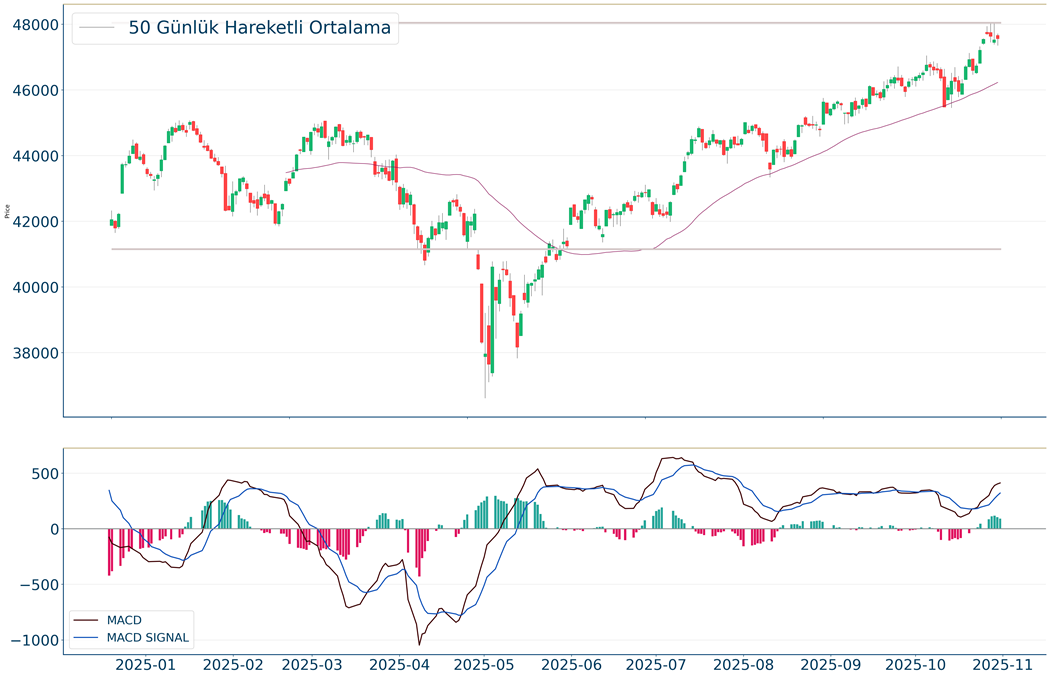 Geçtiğimiz günü %0.09 yükselişle tamamladı. Dow Jones Endeksi 20 günlük hareketli ortalamasının üzerinde kapanış gerçekleştirerek aylık görünümünü güçlendirdi. Yükseliş halinde ilk direnç olarak 48.579 seviyesi takip edilirken bu direncin de geçilmesi halinde 48.879 takip edilebilir. Negatif hareketlerde ise destekler 47.169 ve 46.416 olarak izlenebilir.