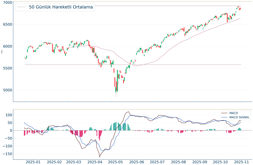 S&P 500 Endeksi, günlük periyotta %0.26 arttı. Haftalık bakıldığında %0.71 yukarıda ve aylık bakıldığında ise %1.85 yukarıda seyrederken güncel olarak 6.840 seviyesinden işlem görmekte. Teknik göstergelere bakıldığında MACD al pozisyonunda, pozitif bölgede hareket ediyor. Ayrıca RSI değerine göre aşırı alım veya satım bölgesinde olmadığı gözleniyor. İşlem yaparken 6.994 ve 7.039 dirençleri ve 6.787 ve 6.673 destekleri izlenebilir.