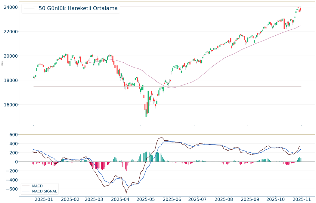Nasdaq Endeksi kapanışla birlikte %0.61 yükseliş gerçekleştirdi. Güne 23.941 seviyesinde başladı ve gün içinde en yüksek 23.946, en düşük 23.628 seviyesinden işlem gördü. Kapanışı ise 23.724 seviyesinde tamamladı. Kısa vadede negatif görüntü hakimdir. MACD al pozisyonunda, pozitif bölgede hareket ediyor. Yukarı yönlü hareketlerde izlenebilecek birinci direnç 24.298 olurken destek olarak 23.549 izlenebilir.