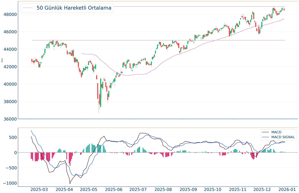 Dow Jones Endeksi geçtiğimiz günü 48.461 seviyesinde %0.51 düşüşle tamamladı. Önemli momentum indikatörlerinden biri olan RSI değerine bakıldığında ise aşırı alım veya satım bölgesinde olmadığı görülebilir. Öte yandan, ilk direnç olarak 49.553 seviyesi karşımıza çıkarken bu seviyenin üzerinde 49.811 direncine yönelim gerçekleşebilir. Aşağı yönlü işlemlerde ise 48.136 ve 47.363 destekleri takip edilmelidir.