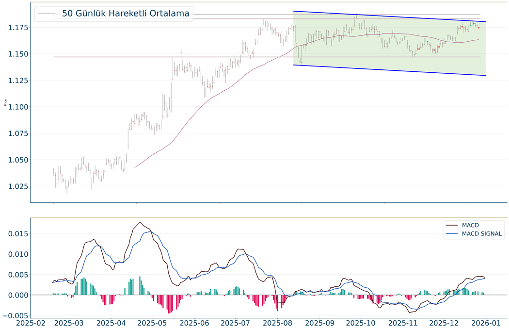 EUR/USD, geçtiğimiz günü %0.25 düşüş ile kapattıktan sonra, 20 günlük hareketli ortalaması olan 1,172 seviyesinin üzerinde fiyatlanıyor. Bu durum EUR/USD için aylık periyotta pozitif bir görüntü çiziyor. Son günde yapılan işlemlerde ise en yüksek 1,175 seviyesinde işlem gördükten sonra günü 1,174 seviyesinde tamamladı. Öte yandan, trend göstergelerinden biri olan MACD çizgisi sinyal çizgisinin üzerinde, pozitif bölgede yer alıyor. 1,199-1,203 dirençler, 1,167-1,151 destekler olarak değerlendirilebilir.