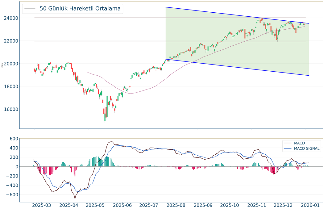 Nasdaq Endeksi kapanışla birlikte %0.24 düşüş gerçekleştirdi. Güne 23.465 seviyesinde başladı ve gün içinde en yüksek 23.521, en düşük 23.414 seviyesinden işlem gördü. Kapanışı ise 23.419 seviyesinde tamamladı. Kısa vadede negatif görünüm mevcuttur. MACD çizgileri al konumunda, sıfır çizgisinin üzerinde hareket ediyor. Gün içinde pozitif performans gerçekleşmesi halinde 23.942-24.051 direnç, negatif performans gerçekleşmesi halinde ise 23.273-22.913 destek seviyeleri olarak izlenebilir.