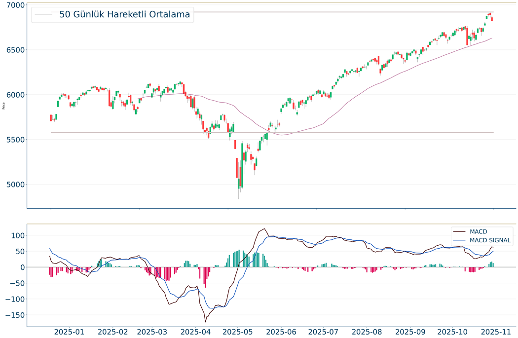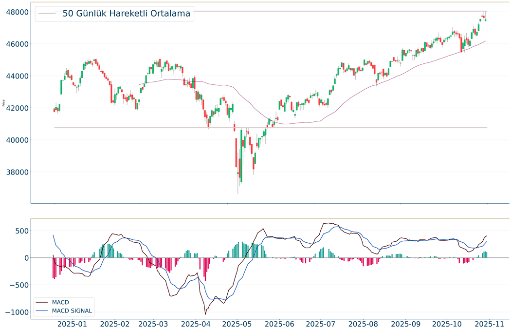 Dow Jones Endeksi geçtiğimiz gün %0.23 azalarak 47.522 seviyelerinden işlem görüyorken 50 günlük hareketli ortalaması olan 46.173 seviyesinin de %3 üzerinde seyrediyor. Bu seviyeye göre Dow Jones Endeksi için orta vadeli negatif görünüm hakimdir. Destek ve direnç seviyeleri; Gün içinde pozitif performans gerçekleşmesi halinde 48.699-49.040 direnç, negatif performans gerçekleşmesi halinde ise 47.199-46.311 destek seviyeleri olarak izlenebilir.