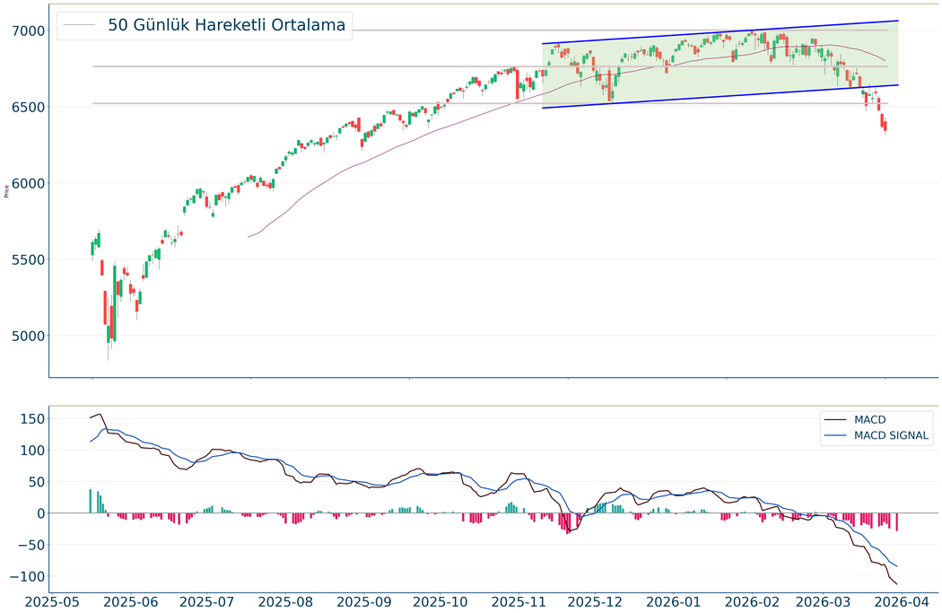 S&P 500 Endeksi geçtiğimiz günü 6.343 seviyesinde %0.39 düşüşle tamamladı. Önemli momentum indikatörlerinden biri olan RSI değerine bakıldığında ise aşırı satım bölgesinde olduğu görülebilir. Öte yandan, ilk direnç olarak 6.508 seviyesi karşımıza çıkarken bu seviyenin üzerinde 6.561 direncine yönelim gerçekleşebilir. Aşağı yönlü işlemlerde ise 6.299 ve 6.170 destekleri takip edilmelidir.