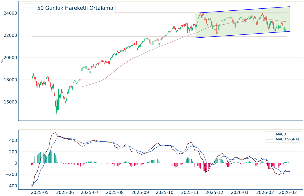 Nasdaq Endeksi kapanışla birlikte %1.02 düşüş gerçekleştirdi. Güne 22.292 seviyesinde başladı ve gün içinde en yüksek 22.601, en düşük 22.124 seviyesinden işlem gördü. Kapanışı ise 22.516 seviyesinde tamamladı. Son kapanış 5 günlük hareketli ortalamanın altında gerçekleşti. MACD sat pozisyonunda, negatif bölgede hareket ediyor. 23.187 seviyesinin geçilmesi halinde yükseliş eğilimli hareketler izlenebilirken yeni direnç olarak 22.970 karşımıza çıkacaktır. 22.408 ise önemli destek konumundadır. Bu desteğin altına gelinmesi halinde 22.203 yeni destek olarak takip edilebilir.