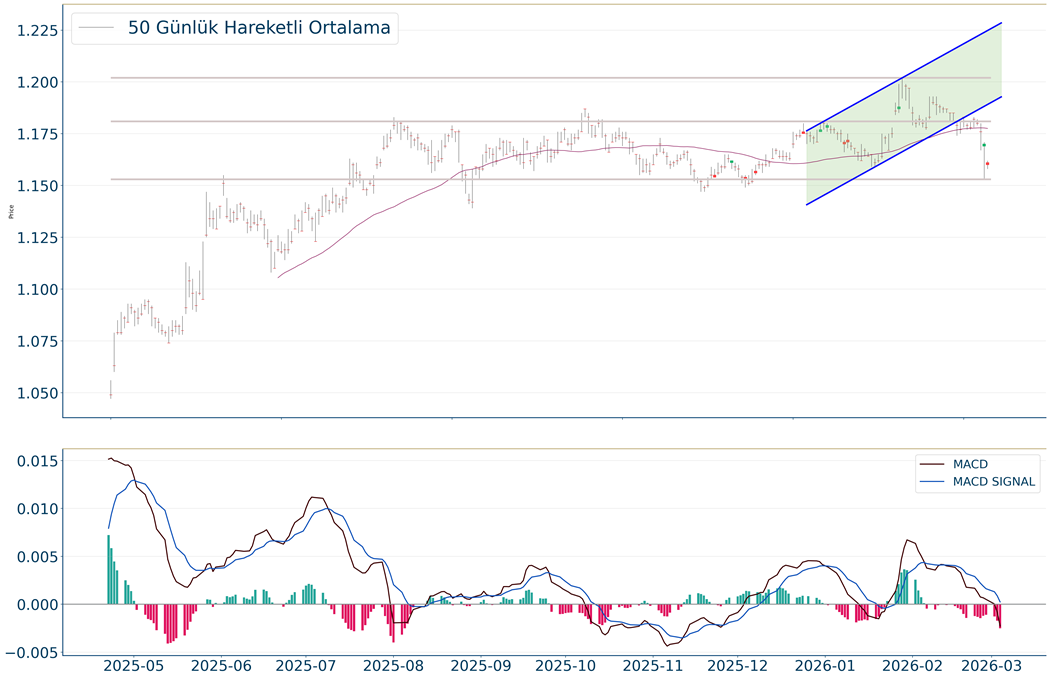 EUR/USD kapanışla birlikte %0.81 düşüş gerçekleştirdi. Güne 1,161 seviyesinde başladı ve gün içinde en yüksek 1,162, en düşük 1,158 seviyesinden işlem gördü. Kapanışı ise 1,16 seviyesinde tamamladı. Son kapanış 5 günlük hareketli ortalamanın altında gerçekleşti. MACD çizgisi sinyal çizgisinin altında, negatif bölgede yer alıyor. 1,192 seviyesinin geçilmesi halinde yükseliş eğilimli hareketler izlenebilirken yeni direnç olarak 1,185 karşımıza çıkacaktır. 1,155 ise önemli destek konumundadır. Bu desteğin altına gelinmesi halinde 1,152 yeni destek olarak takip edilebilir.