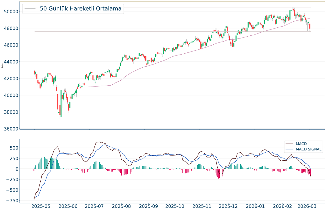 Dow Jones Endeksi için günlük değişim %1.61 düşüşle gerçekleşmiş oldu.5 iş gününe göre hesaplanan hareketli ortalamaya göre olumsuz görünümdedir. Gün kapanışına göre 48.259 desteği kırıldı. Yeni destekler 47.533-46.551 haline geldi. 49.149-49.614 noktaları ise dirençler olarak takip edilebilir.