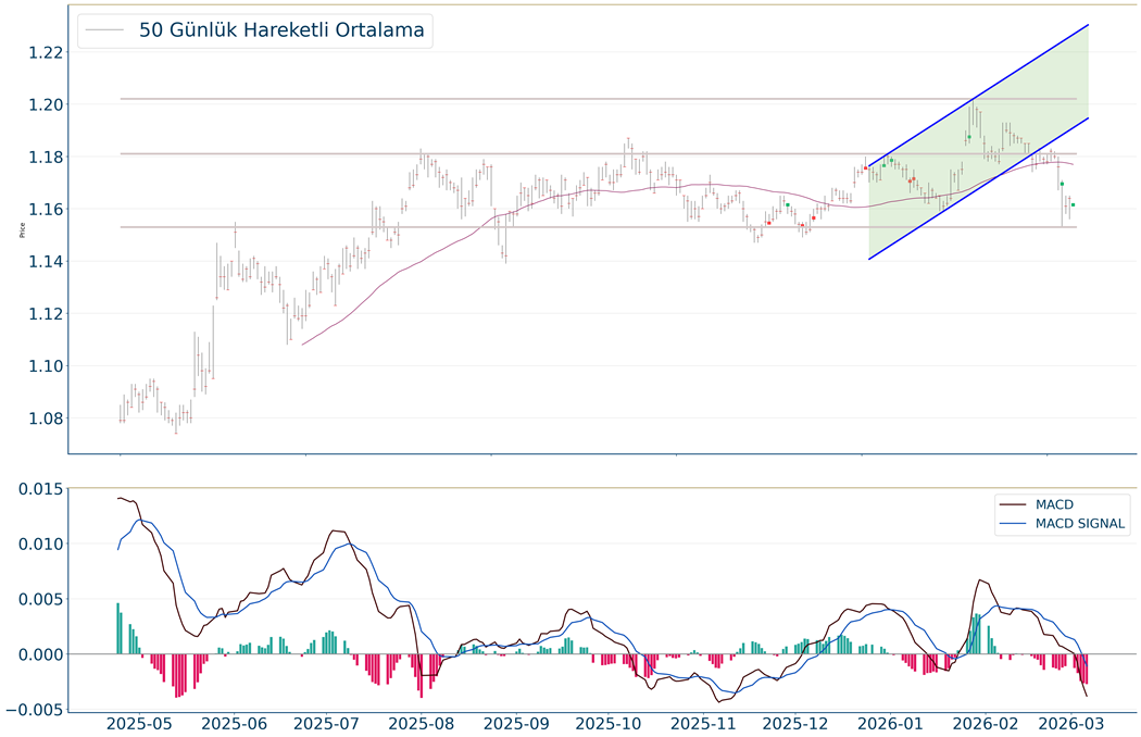 Gün içi görülen en yüksek seviye 1,162 iken kapanış 1,162 seviyesinde %0.14 düşüş ile gerçekleşti. Ortalama işlem hacimlerine bakıldığında ise 5 iş günü için gözlenirken 5 günlük hareketli ortalamanın altında hareket etmesi kısa vadedeki olumsuz görünüme işaret ediyor. Ayrıca, gün itibarıyla 1,154 seviyesi yeni destek görevi görürken kısa vadeli direnç 1,186 seviyesi oldu. Endeksin aşağı yönlü hareketini devam ettirmesi halinde 1,138 seviyesi ikinci destek görevi görürken yukarı yönlü hareketlerde ise 1,191 seviyesini ikinci direnç olarak izleyeceğiz.