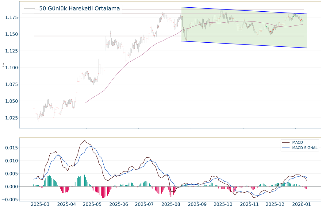 EUR/USD, geçtiğimiz günü %0.13 düşüş ile kapattıktan sonra, 20 günlük hareketli ortalaması olan 1,173 seviyesinin altında fiyatlanıyor. Bu durum EUR/USD için aylık periyotta negatif bir görüntü çiziyor. Son günde yapılan işlemlerde ise en yüksek 1,17 seviyesinde işlem gördükten sonra günü 1,17 seviyesinde tamamladı. Öte yandan, trend göstergelerinden biri olan MACD çizgisi sinyal çizgisinin altında, pozitif bölgede yer alıyor. 1,194-1,199 dirençler, 1,162-1,146 destekler olarak değerlendirilebilir.