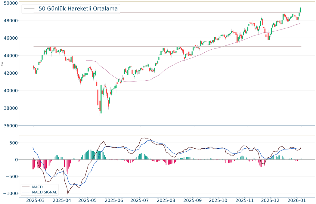 Dow Jones Endeksi dün gerçekleşen işlemlerde en yüksek 49.509, en düşük ise 48.923 seviyesinde işlem gördükten sonra %0.99 artarak artarak 49.462 seviyesinde günü tamamladı. 20 günlük hareketli ortalamanın üzerinde hareket etmesi ise Dow Jones Endeksi adına olumlu olarak nitelendirilebilir. Gün içi işlemlerde 48.902 ve 48.101 desteklerini ve 50.432 ve 50.856 dirençlerini takip edeceğiz.