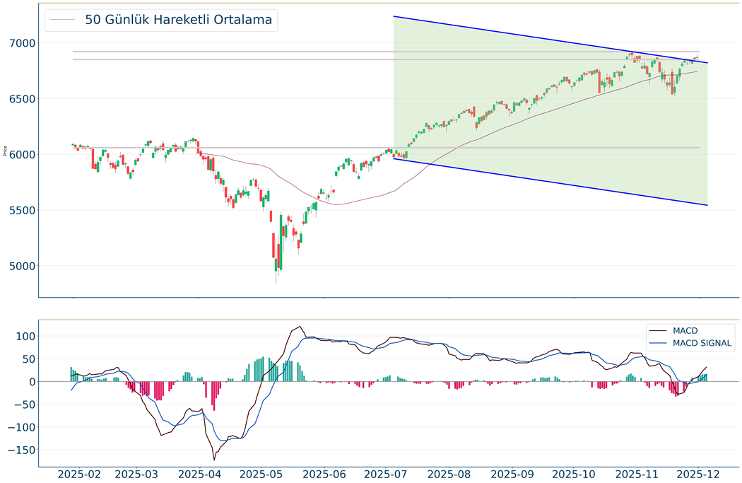 S&P 500 Endeksi, geçtiğimiz günü %0.19 yükseliş ile kapattıktan sonra, 20 günlük hareketli ortalaması olan 6.757 seviyesinin üzerinde fiyatlanıyor. Bu durum S&P 500 Endeksi için aylık periyotta pozitif bir görüntü çiziyor. Son günde yapılan işlemlerde ise en yüksek 6.895 seviyesinde işlem gördükten sonra günü 6.870 seviyesinde tamamladı. Öte yandan, trend göstergelerinden biri olan MACD al pozisyonunda, pozitif bölgede hareket ediyor. 7.020-7.056 dirençler, 6.822-6.716 destekler olarak değerlendirilebilir.