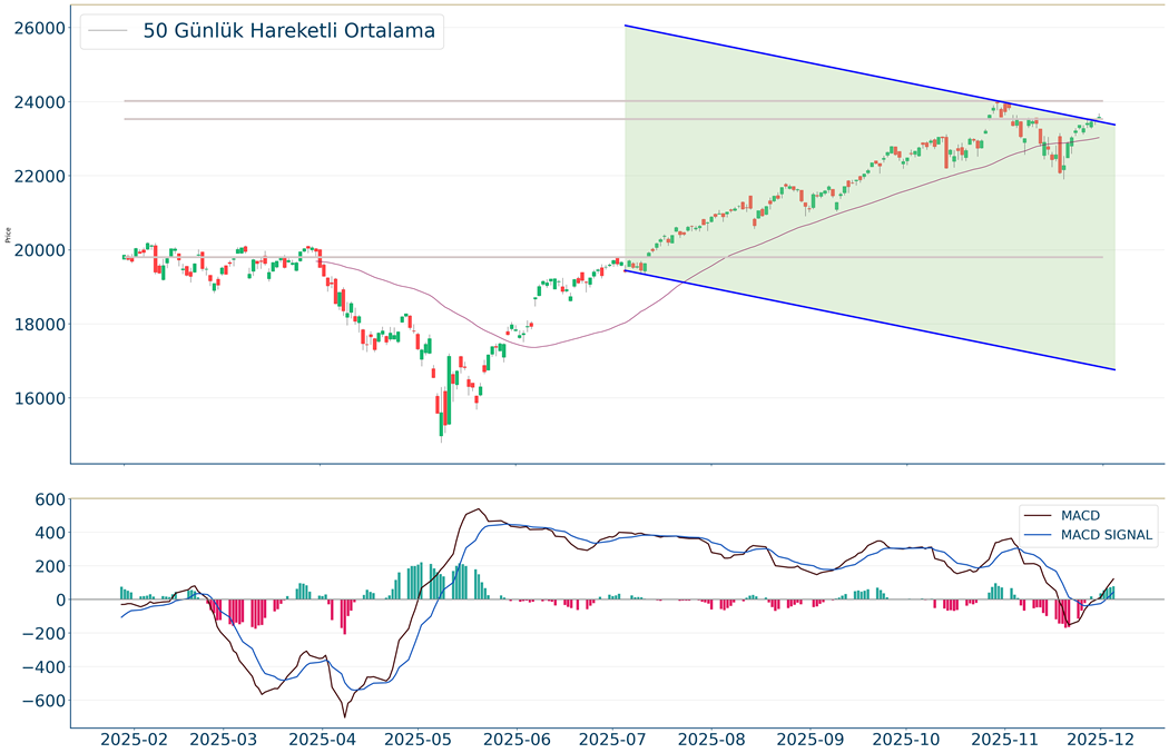Gün içi görülen en yüksek seviye 23.680 iken kapanış 23.578 seviyesinde %0.31 yükseliş ile gerçekleşti. Ortalama işlem hacimlerine bakıldığında ise 5 iş günü için gözlenirken 5 günlük hareketli ortalamanın üzerinde hareket etmesi kısa vadedeki olumlu görünüme işaret ediyor. Ayrıca, gün itibarıyla 23.401 seviyesi yeni destek görevi görürken kısa vadeli direnç 24.097 seviyesi oldu. Endeksin aşağı yönlü hareketini devam ettirmesi halinde 23.024 seviyesi ikinci destek görevi görürken yukarı yönlü hareketlerde ise 24.236 seviyesini ikinci direnç olarak izleyeceğiz.
