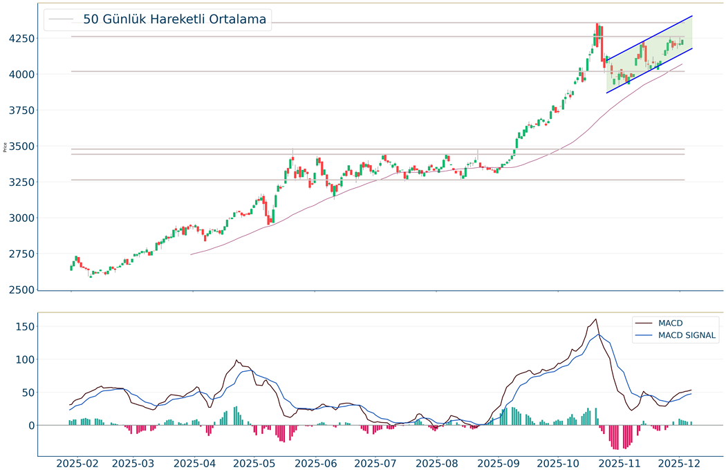 Geçtiğimiz günü %0.6 yükselişle tamamladı. Ons Altın 20 günlük hareketli ortalamasının üzerinde kapanış gerçekleştirdi.20-50-200 günlük hareketli ortalamalar 4.147, 4.070, 3.492 olarak sıralanabilir. Gün içinde pozitif performans gerçekleşmesi halinde 4.306-4.328 direnç, negatif performans gerçekleşmesi halinde ise 4.191-4.142 destek seviyeleri olarak izlenebilir.