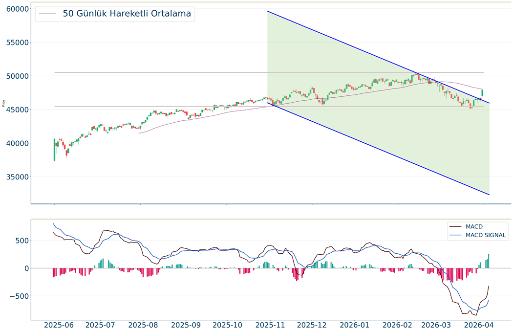 Dow Jones Endeksi dün gerçekleşen işlemlerde en yüksek 48.017, en düşük ise 46.978 seviyesinde işlem gördükten sonra %2.85 artarak artarak 47.909 seviyesinde günü tamamladı. 20 günlük hareketli ortalamanın üzerinde hareket etmesi ise Dow Jones Endeksi adına olumlu olarak nitelendirilebilir. Gün içi işlemlerde 47.193 ve 46.300 desteklerini ve 48.830 ve 49.435 dirençlerini takip edeceğiz.