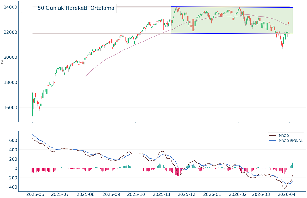 Nasdaq Endeksi geçtiğimiz gün %2.8 artarak 22.634 seviyelerinden işlem görüyorken 50 günlük hareketli ortalaması üzerinde seyrediyor. Bu seviyeye göre Nasdaq Endeksi için orta vadeli negatif görünüm hakimdir. Destek ve direnç seviyeleri; Son işlem günü kapanışına göre 22.424 direnci kırıldı ve 23.166 seviyesi ilk direnç oldu. Bu seviyenin de geçilmesi halinde 23.347 direnci takip edilecektir. Negatif hareketlilik halinde ise 22.446-22.030 destek seviyeleri olarak değerlendirilebilir.