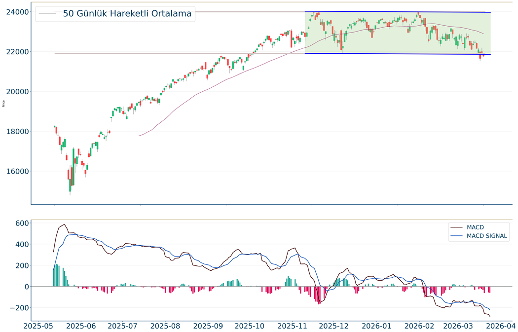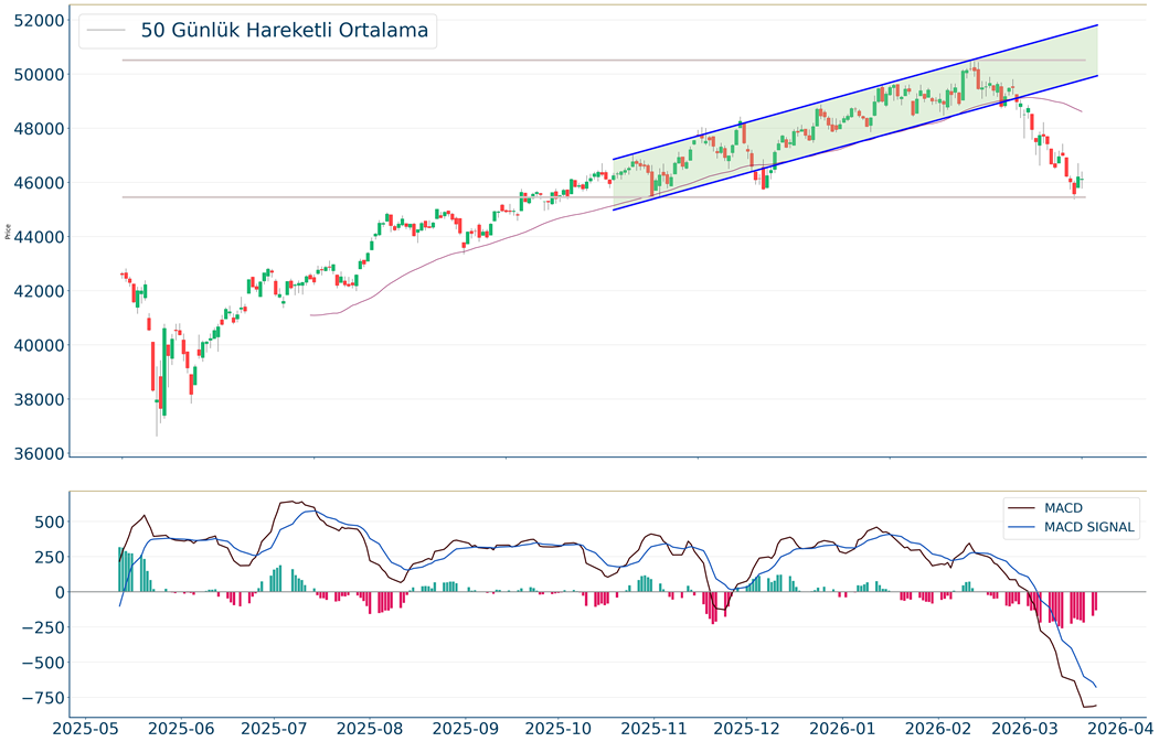 Dow Jones Endeksi kapanışla birlikte %1.38 yükseliş gerçekleştirdi. Güne 45.803 seviyesinde başladı ve gün içinde en yüksek 46.712, en düşük 45.803 seviyesinden işlem gördü. Kapanışı ise 46.208 seviyesinde tamamladı. Son kapanış 5 günlük hareketli ortalamanın üzerinde gerçekleşti. MACD çizgisi sinyal çizgisinin altında, negatif bölgede yer alıyor. Gün içinde pozitif performans gerçekleşmesi halinde 47.334-47.789 direnç, negatif performans gerçekleşmesi halinde ise 45.779-44.845 destek seviyeleri olarak izlenebilir.