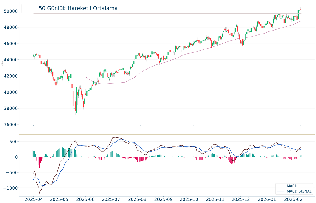 Gün içi görülen en yüksek seviye 50.219 iken kapanış 50.135 seviyesinde %0.04 yükseliş ile gerçekleşti. Ortalama işlem hacimlerine bakıldığında ise 5 iş günü için gözlenirken 5 günlük hareketli ortalamanın üzerinde hareket etmesi kısa vadedeki olumlu görünüme işaret ediyor. Ayrıca, gün itibarıyla 49.681 seviyesi yeni destek görevi görürken kısa vadeli direnç 51.163 seviyesi oldu. Endeksin aşağı yönlü hareketini devam ettirmesi halinde 48.907 seviyesi ikinci destek görevi görürken yukarı yönlü hareketlerde ise 51.492 seviyesini ikinci direnç olarak izleyeceğiz.