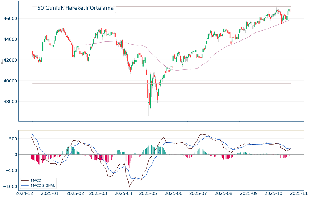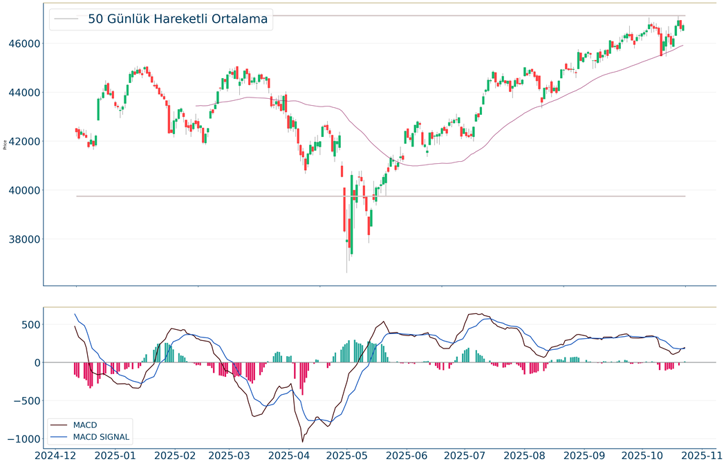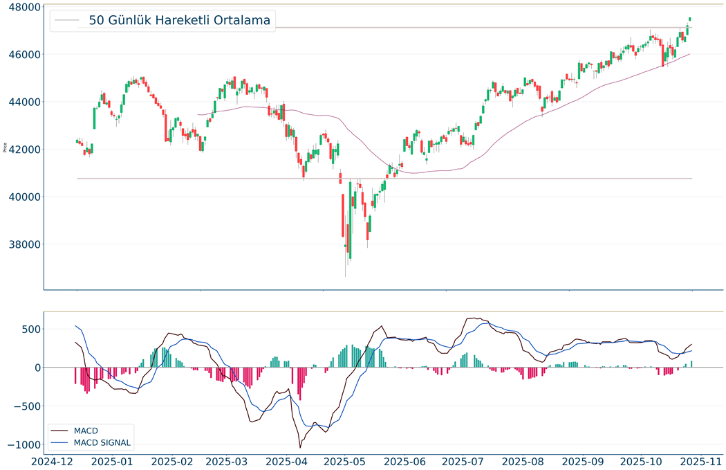 Dow Jones Endeksi kapanışla birlikte %0.47 yükseliş gerçekleştirdi. Güne 46.707 seviyesinde başladı ve gün içinde en yüksek 47.125, en düşük 46.688 seviyesinden işlem gördü. Kapanışı ise 46.924 seviyesinde tamamladı. Kısa vadede pozitif görünüm mevcuttur. MACD çizgileri al konumunda, sıfır çizgisinin üzerinde hareket ediyor. 47.639 seviyesinin geçilmesi halinde yükseliş eğilimli hareketler izlenebilirken yeni direnç olarak 47.946 karşımıza çıkacaktır. 46.229 ise önemli destek konumundadır. Bu desteğin altına gelinmesi halinde 46.531 yeni destek olarak takip edilebilir.